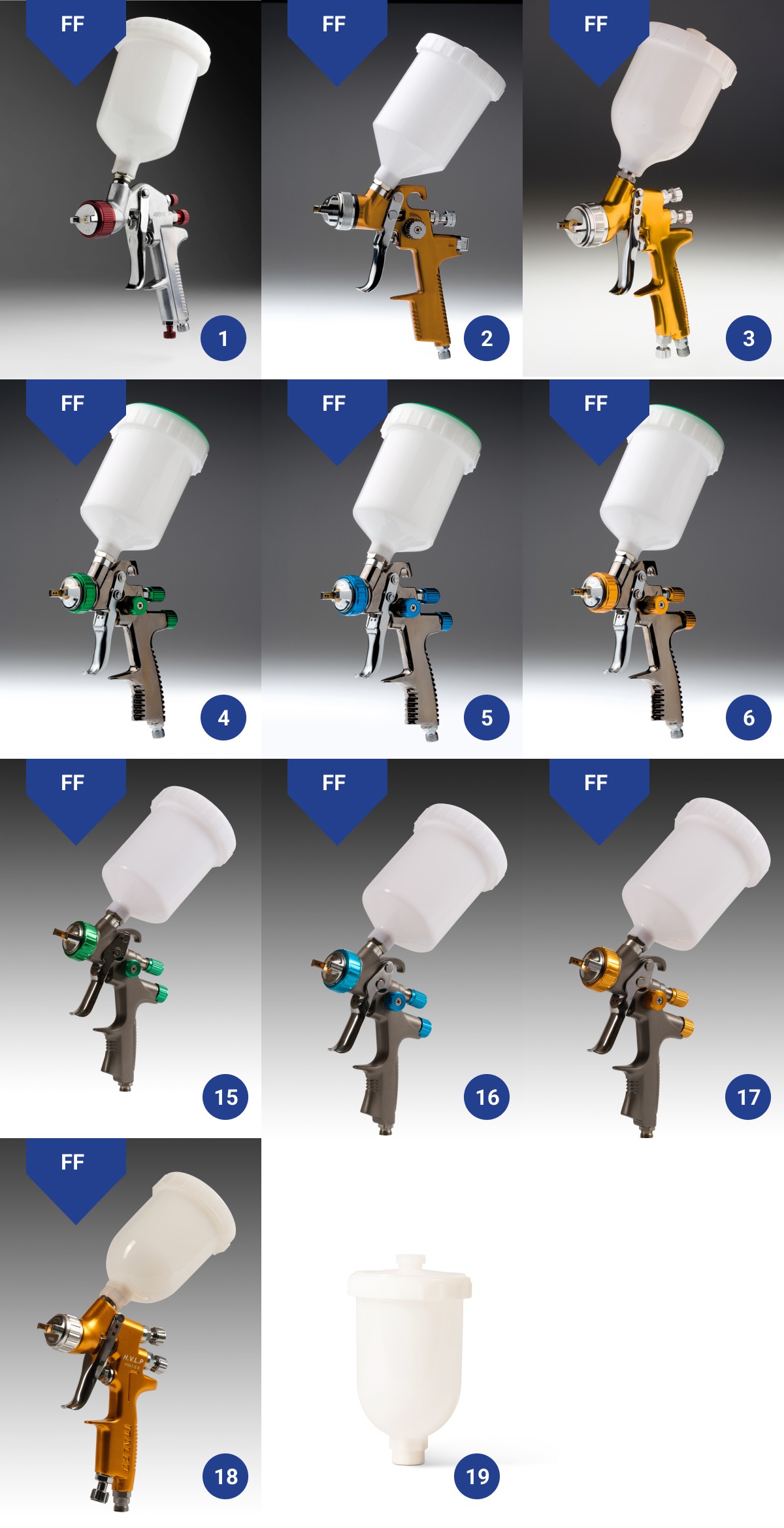 HVLP und LVLP Lackierpistolen mit Düsen von 1.3mm bis zu 2.5mm.