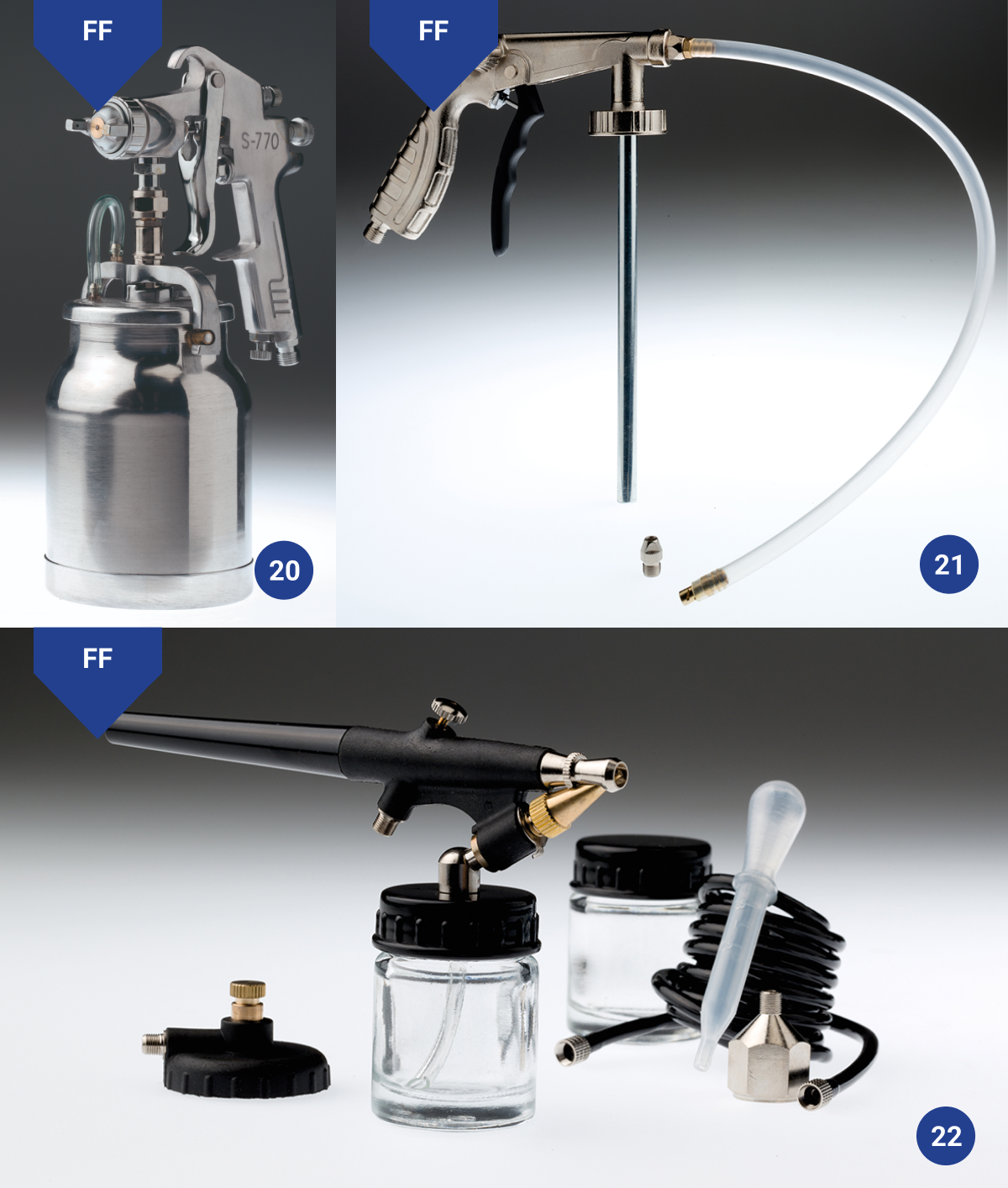 Zusätzlich zu unserem Sortiment von Fließbecherlackierpistolen, bieten wir auch Saugbecherpistolen, Unterbodenschutzpistolen und einer Airbrushsprühpistole an.