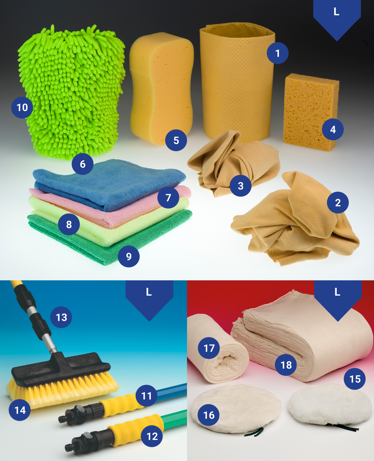 Eine Auswahl an Autopflegeartikeln: Schwämmen, Gamsautoledern, Mikrofasertüchern und Waschbürsten. Traditionelle Polierartikeln, wie Lammfellpoliermaschinenhäube und Baumwollrundgestricktücher.