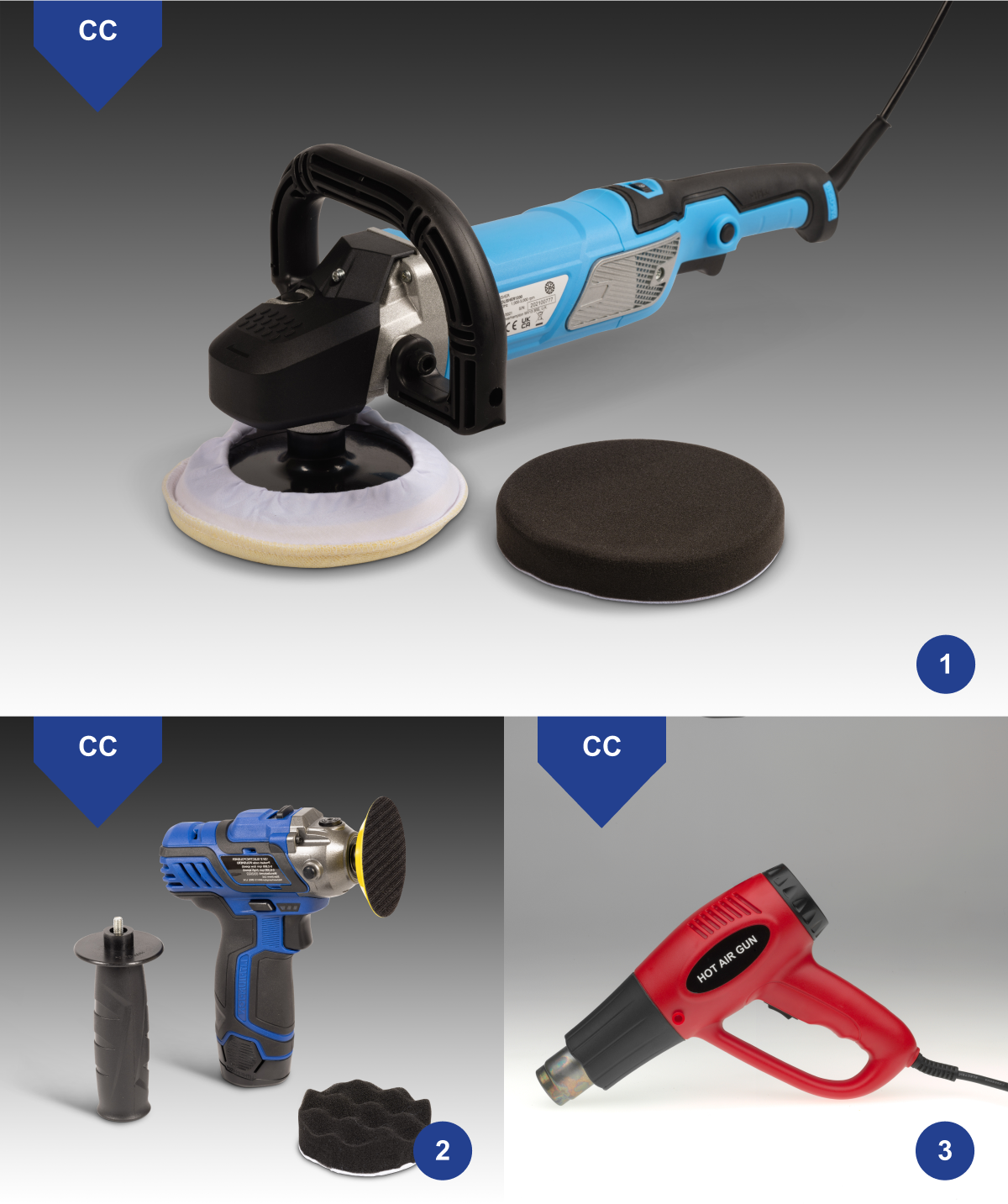 Choose from a traditional electric polisher for polishing larger surfaces or a 12V cordless polisher for smaller jobs. Also available an electric hot air gun to help remove decals.