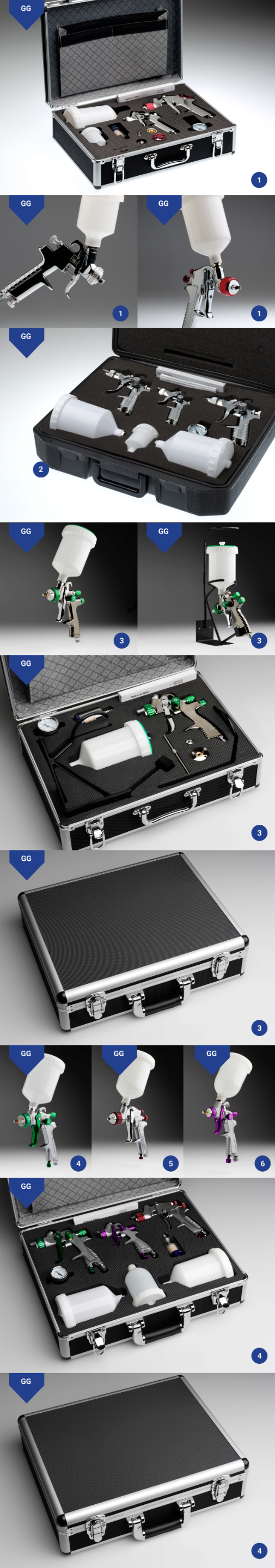 Handy kits containing a selction of sprayguns with different sized sprayguns, nozzle sizes and accessories.