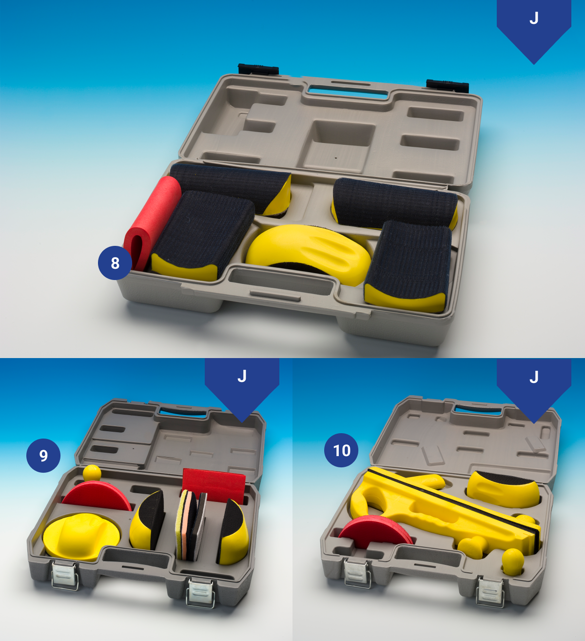 Uma gama de kits de blocos de lixar contendo blocos de diferentes tamanhos para lixar manualmente.